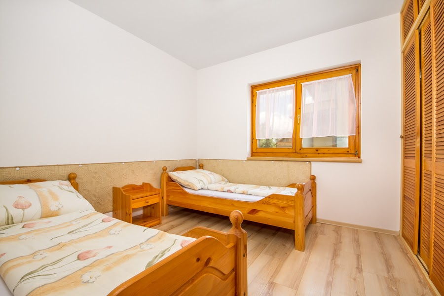 Gr.-floor: Living room with kitchen and lunch-corner (with one bed), shower-bath/WC, two room with two bed, closed terrace.