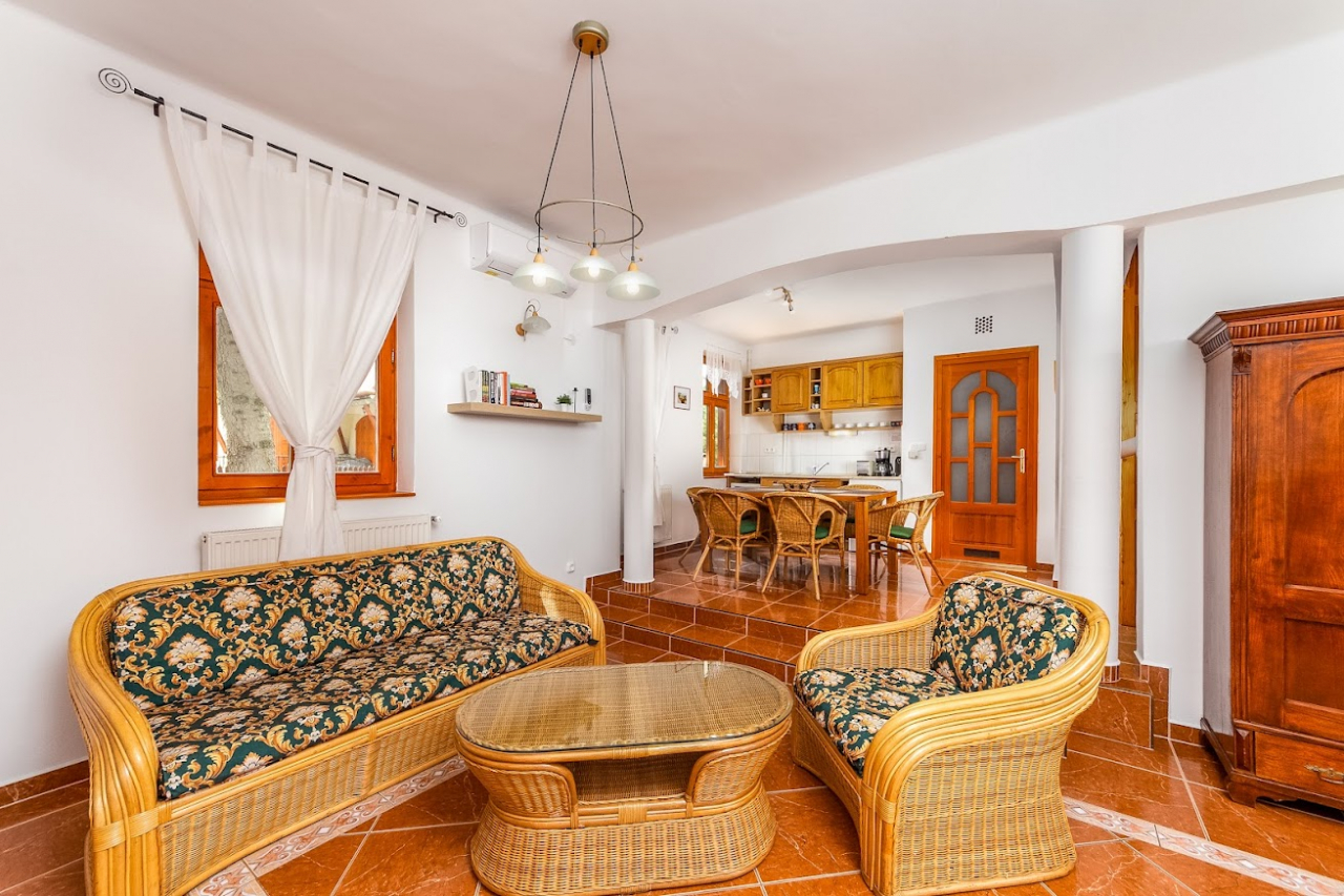 Földszint: Nappali főző- és étkezősarokkal, fürdőszoba, WC, egy kétágyas szoba, fedett terasz.