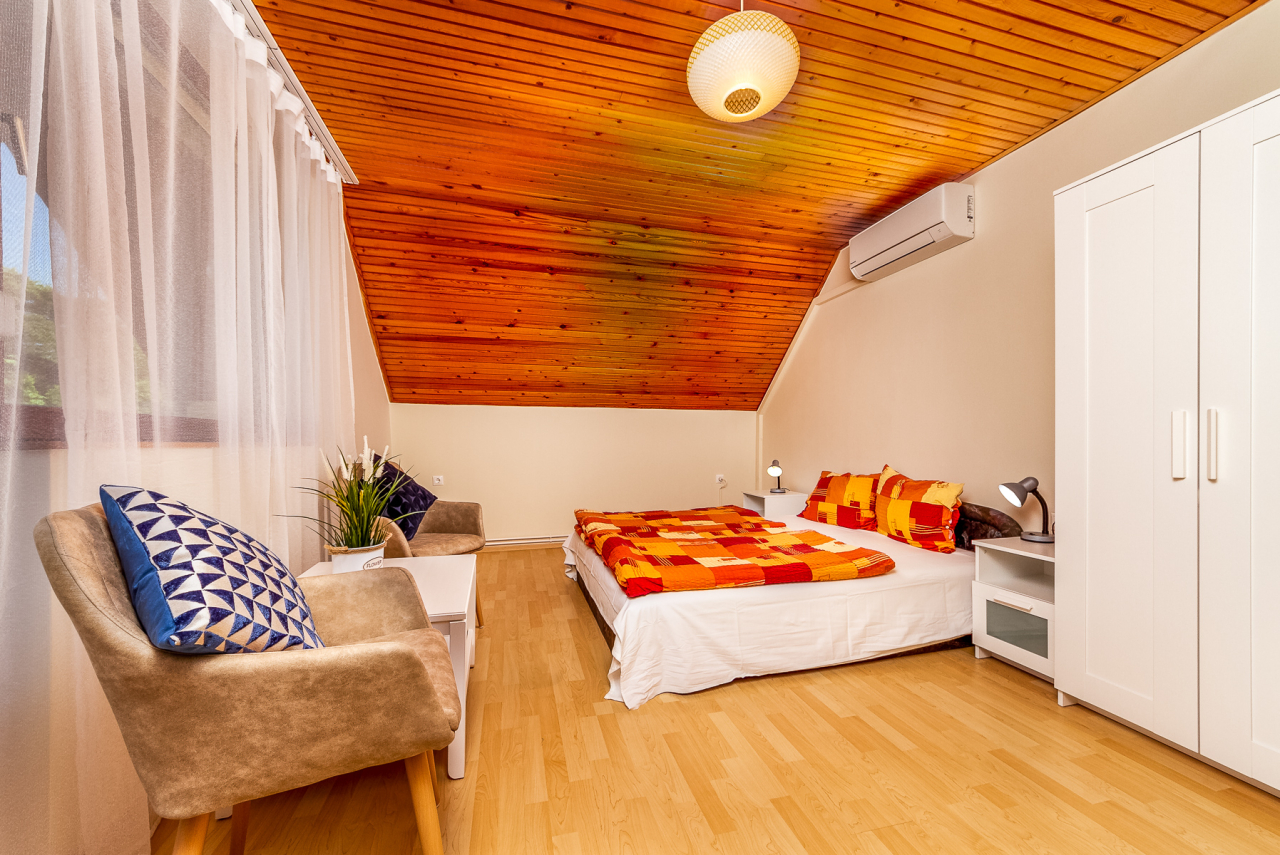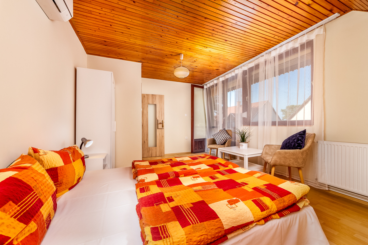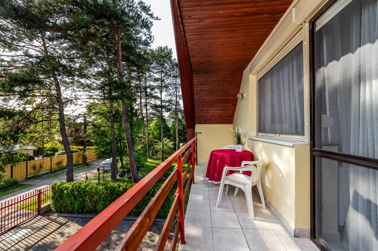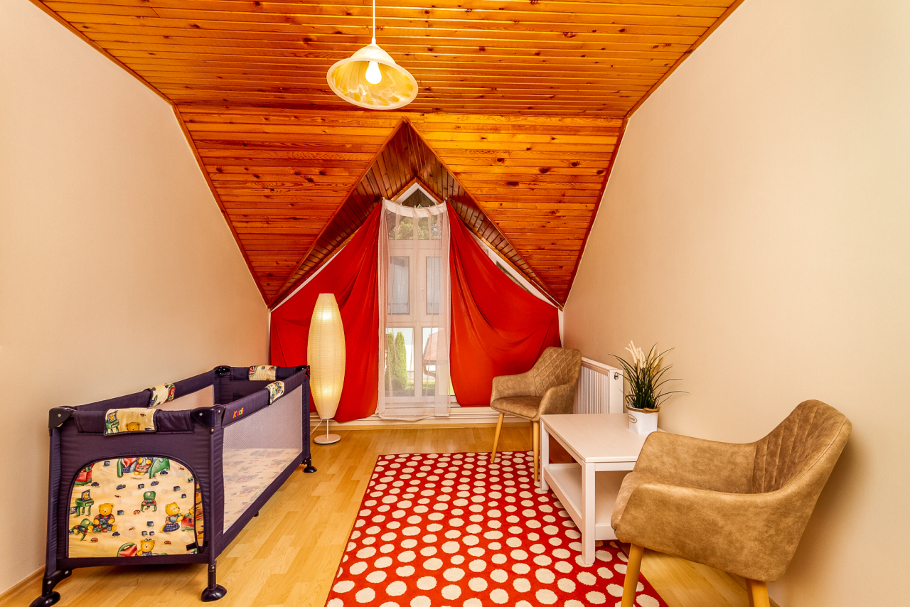 Emelet: előtér teakonyhával, étkezővel, két kétágyas szoba erkéllyel, egy szoba babaággyal, fürdőszoba, WC