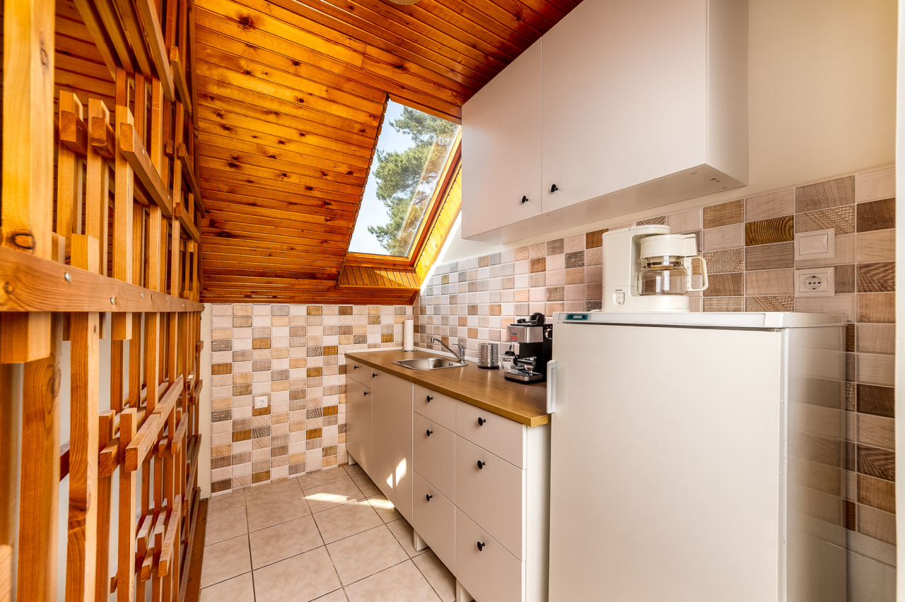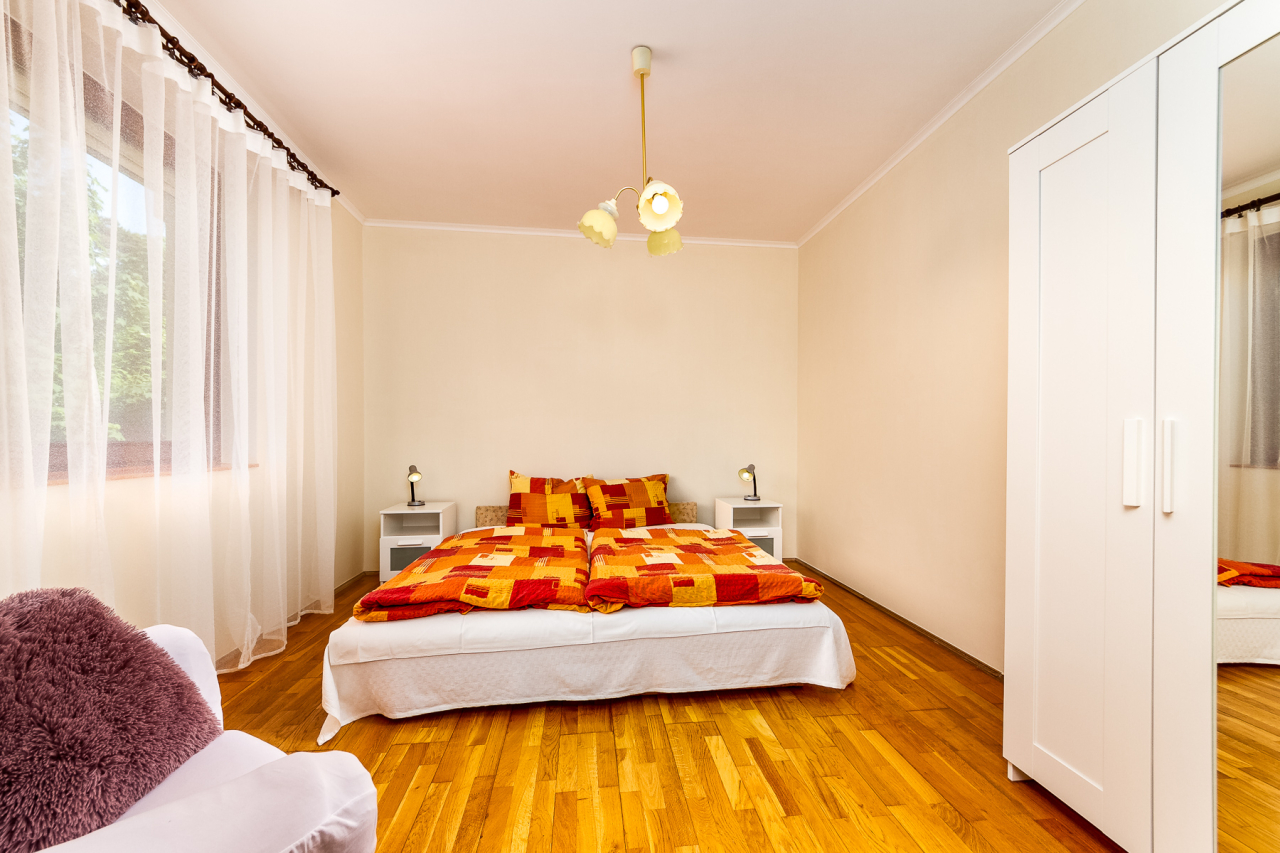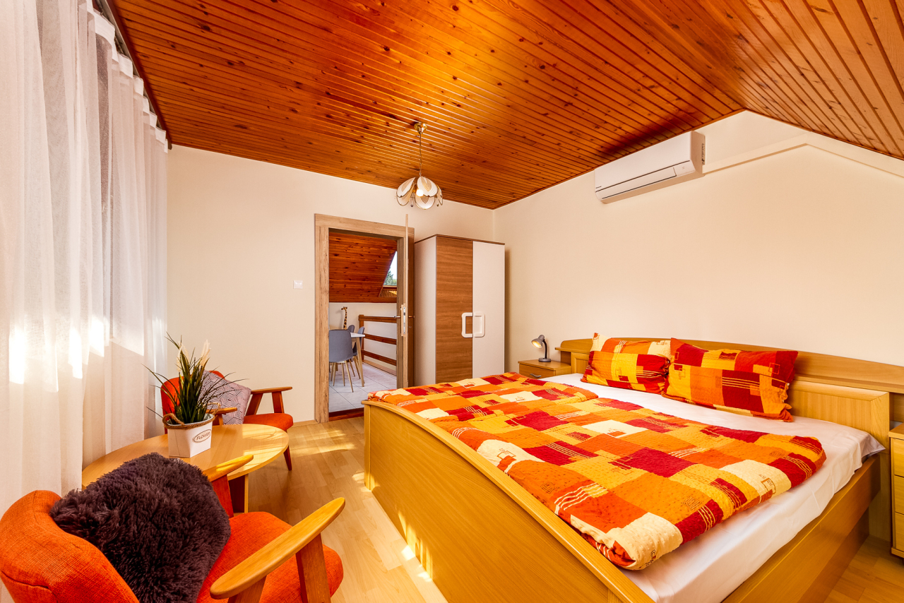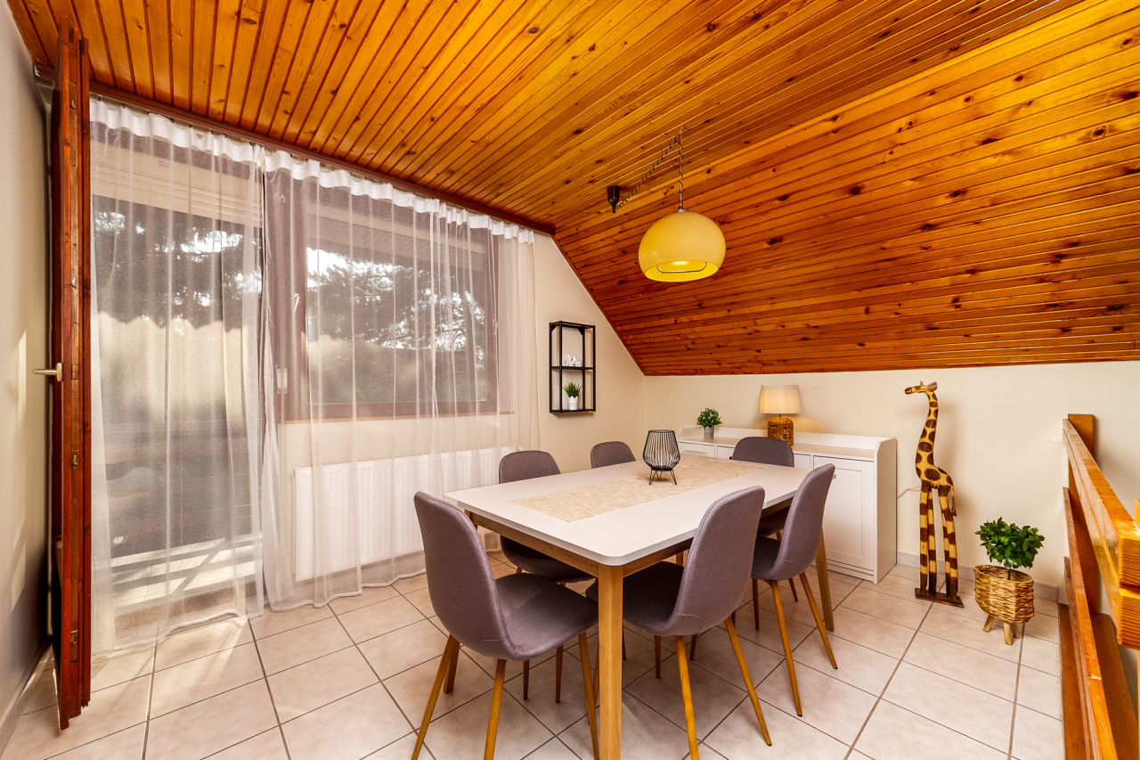 Emelet: előtér teakonyhával, étkezővel, két kétágyas szoba erkéllyel, egy szoba babaággyal, fürdőszoba, WC