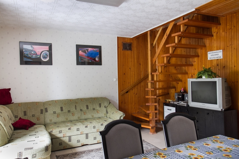 Földszint: Nappali étkezővel, főzőfülke, zuhanyzó/WC, egy kétágyas szoba, terasz, fedett terasz.