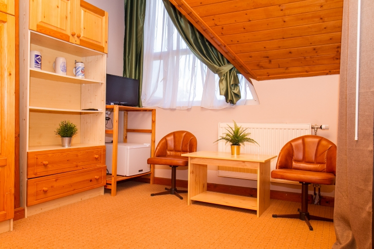 Emelet: Szoba egy fekhellyel, egy hálófülke 2 főre, zuhanyzó/WC, közös konyhahasználat, közös nappali étkezővel, mosógéphasználat